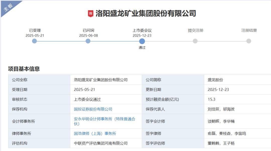 【大河财立方 记者 夏晨翔】12月23日,深交所音书,洛阳盛龙矿业集团股份有限公司(以下简称盛龙股份)首发事项胜仗通过深交所上市审核委员会审议。
